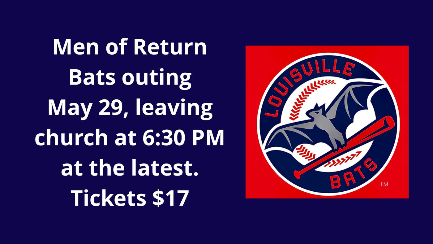 Hey men, you are going to the baseball game! On Friday, May 29th the Men of Return Church will be heading over to Louisville to see the Bats take on the St. Paul Saints. Game starts at 7:15 PM. Vans will leave the church at 6:30 PM sharp. Tickets are $17.00. Signup will be with Julie Lau. Pay when you sign up. If you are paying for a friend or someone who would like to go but doesn’t have the ability to pay, when you sign up, please put their name on the list and pay for them as well.