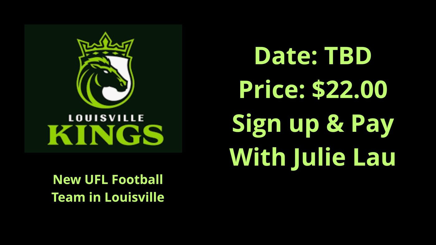 Men, we have a new UFL football team in Louisville, the Kings. We are planning an outing. Date to be either Saturday, May 16 or Sunday, May 24 . The exact date TBD. The cost of the tickets is $22. You will sign up and pay with Julie Lau. The Deadline is either Sunday, April 26 or Sunday, May 23. If you choose to pay for another person at that time, we will need you to designate who that person is at the time you are paying.