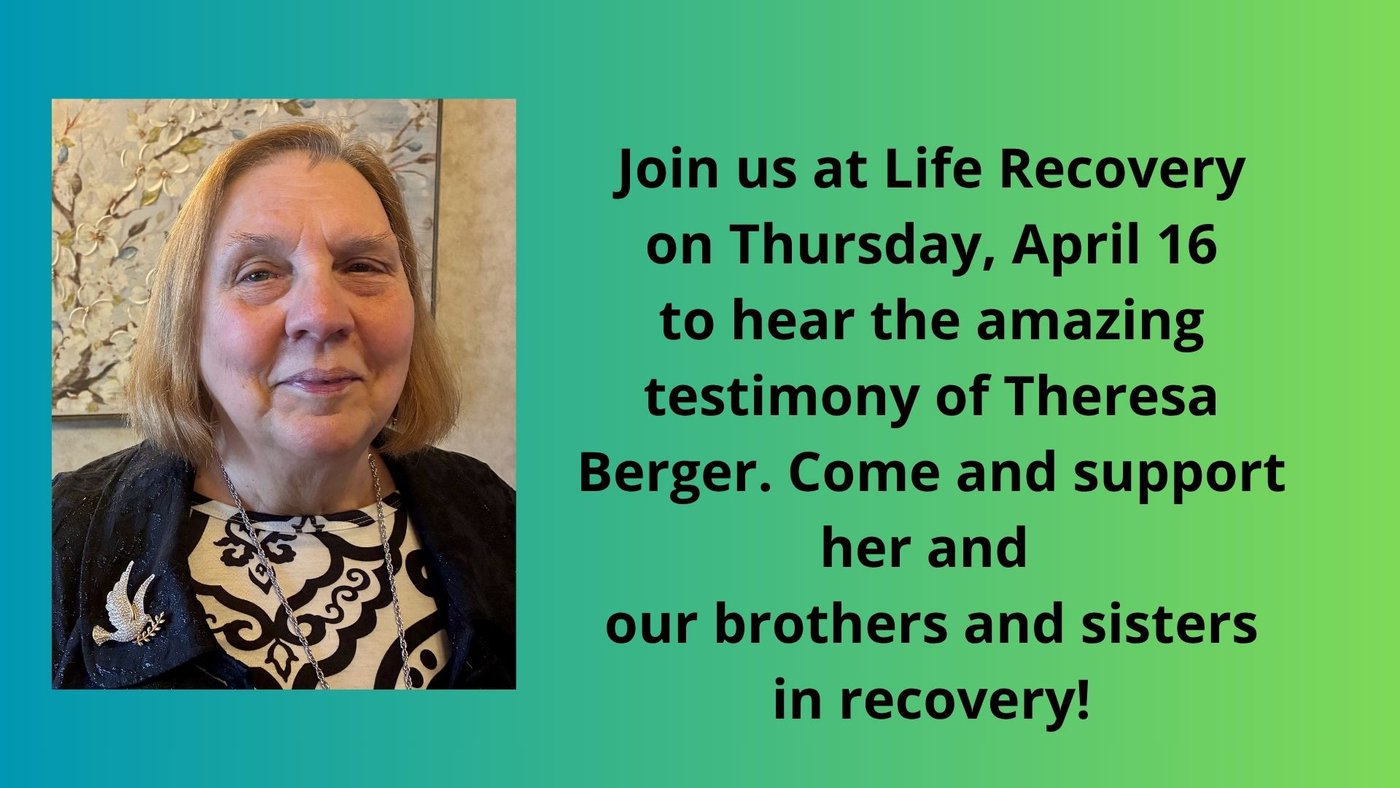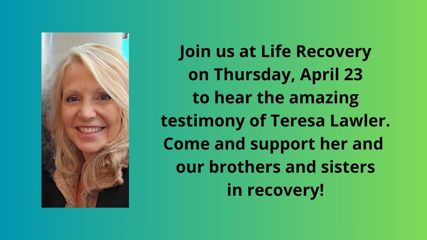 Join our brothers and sisters in Life Recovery to hear our sister give her testimony and support them.