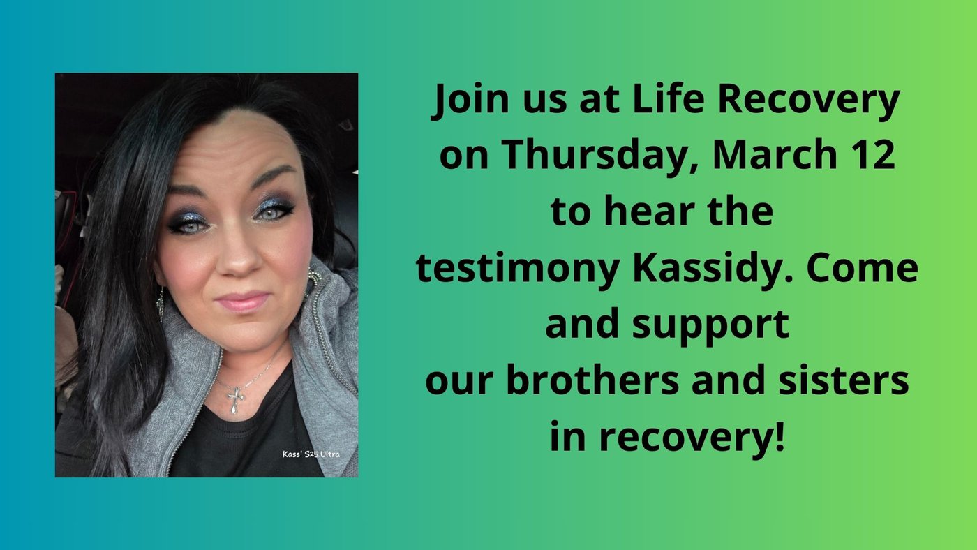 On Thursday, March 12, Life Recovery will have a guest speaker. Kassidy is a mom, a Fiancé, and a creative entrepreneur whose life has been transformed by faith and recovery. After years of growth.. and a humbling relapse.. she discovered that what felt like failure was actually God refining and replanting her. Nearly four years into this renewed walk, she lives in gratitude for the grace that carried her through dark seasons and into purpose. Her story is one of surrender, perseverance, and the faithfulness of God.