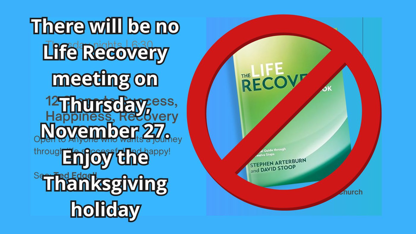 There will be no Life Recovery meeting on Thursday, November 27 (Thanksgiving). Please spend the time with your families and loved ones. We will see you in December.