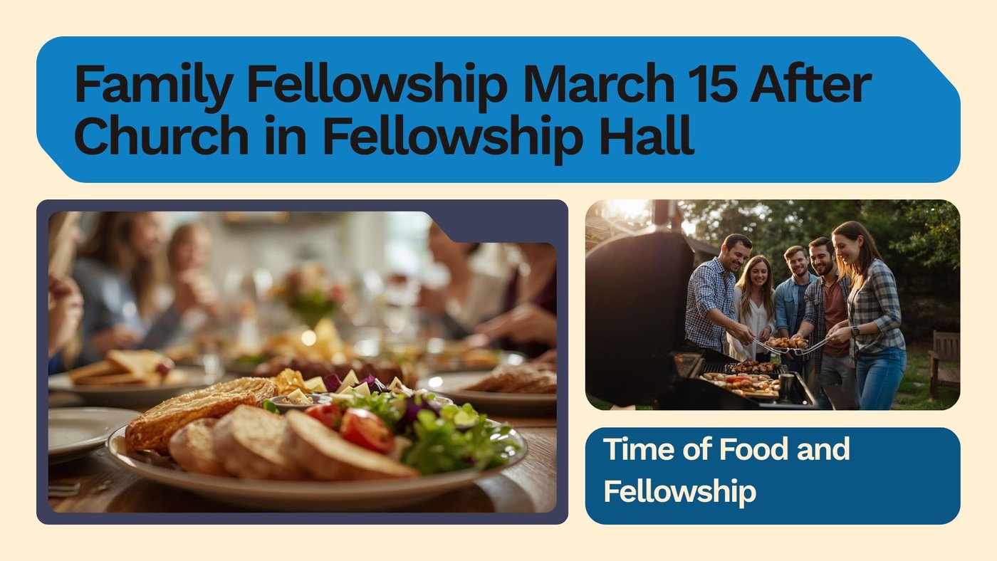 On Sunday, March 15, immediately after the service, we will be hosting a Family Fellowship in the Fellowship Hall.
