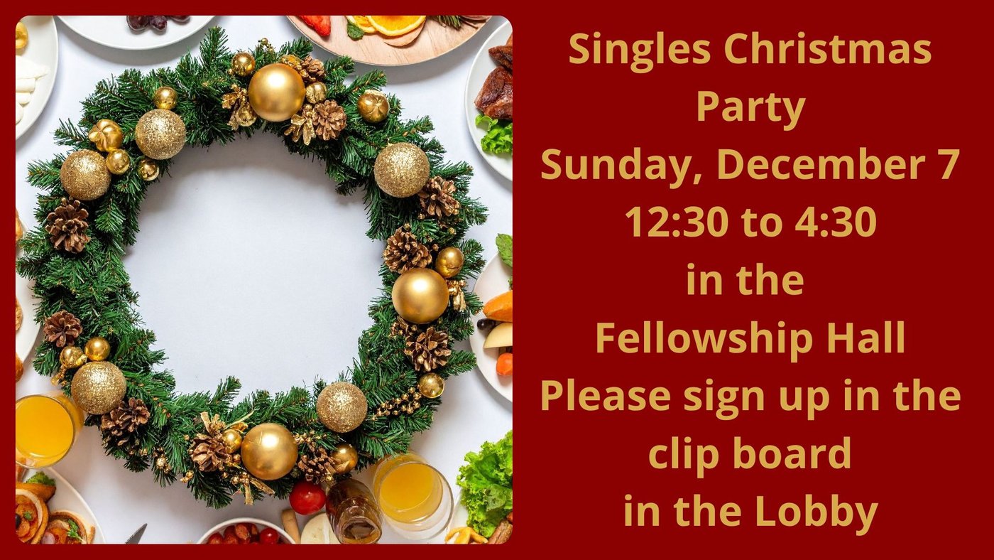 The Return Church Singles are having a Christmas Gathering on Sunday, December 7 immediately after church in the Fellowship Hall. There is a signup sheet in the lobby. If you are planning on attending, please sign up, as we need to know how much food to prepare. If you have any questions, please reach out to Pam Brown or Sam Godinez. You can also call the church office and we will take your information and pass it on to one of them (812-725-8381).