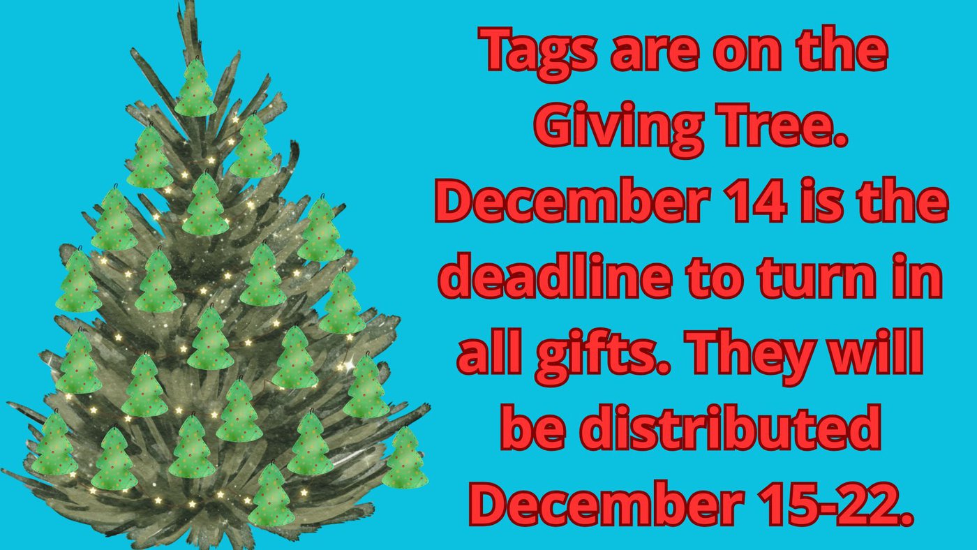 Hey everybody, the tags are on the tree!!! So take a tag and purchase a gift. Please bring the tag back with the gift, as this is the only way we know which gift goes to which child.
