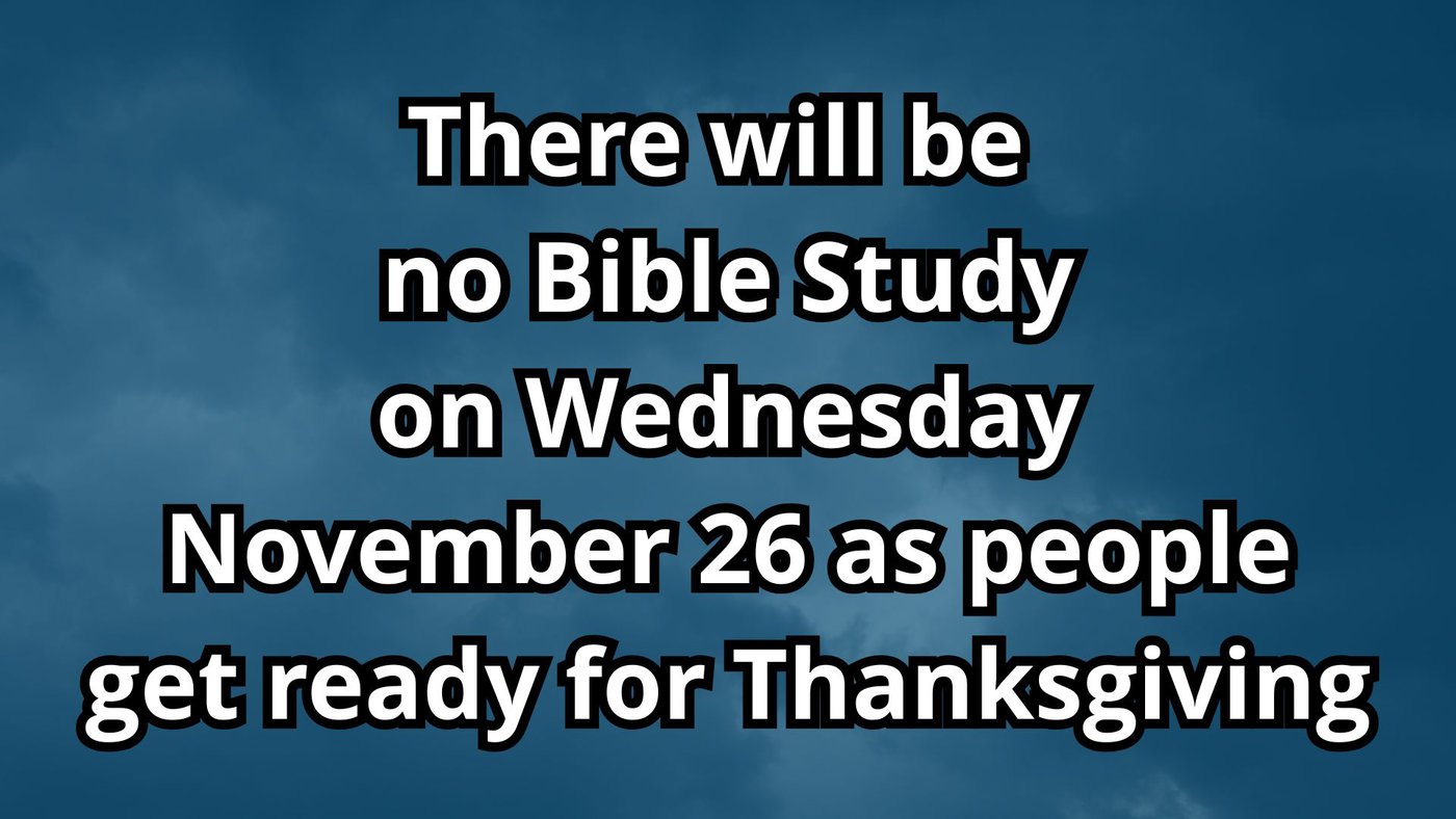 The Wednesday, November 26 Bible study will be cancelled as families get ready to celebrate Thanksgiving the next day. Many of our Return Church family also travel for the holiday.